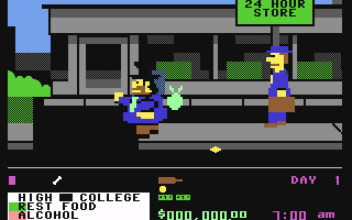 Spillets gang er forholdsvis enkel, men samtidig er det vanskelig å komme langt her. Spillet har heller ingen slutt, det bare varer og varer.. Mynter, pengeseddeler og flasker ligger “strødd” i gata og du starter med å plukke opp og skaffe deg litt mat i en av de mange matbutikkene. Eller kanskje vente til suppekjøkkenet er åpent og få seg noe varmmat gratis? Verdenen er delt opp i fire bydeler og her kan man de forskjellige stedene klippe og barbere seg, få seg sted å bo (lar deg oppe over nattdelen), få seg jobb og inntekt samt utdannelse. Etterhvert som utdannelsen stiger, kan man få seg bedre betalt jobb og mer penger. Men pass deg for skattefuten! Han tar nemlig ALT hvis han dukker opp og er nær deg! Du må hele tiden passe på at måleren for mat er grønn, alkohol derimot er ikke så farlig.. Lite jobb å hente når du er full! Den faller derimot saktere enn matmåleren, så i en krisesituasjon kan den være grei å ha.