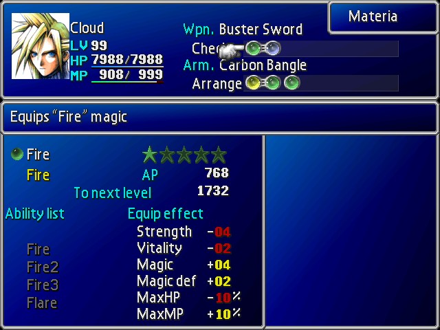 Som i de fleste RPG-spillene så oppgraderes våpen og rustning med spillets historie. Med hvert våpen og armbånd har man muligheten til å fylle opp det respektive utstyret med magi, eller «Materia» som det heter i Final Fantasy VII. Det er det som gjør at dette spillet faktisk er vanvittig moro. Jo bedre våpenet og rustningen er, desto mer «Materia». Det er et hav av «Materia» å velge mellom under disse fargene: Rød – Summon, Grønn – Magic, Gul – Command, Blå – Support, Rosa – Independent